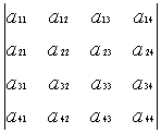 = a11·a22·a33·a44 - a11·a22·a34·a43 - a11·a23·a32·a44 + a11·a23·a34·a42 + a11·a24·a32·a43 - a11·a24·a33·a42             - a12·a21·a33·a44 + a12·a21·a34·a43 + a12·a23·a31·a44 - a12·a23·a34·a41 - a12·a24·a31·a43 + a12·a24·a33·a41             + a13·a21·a32·a44 - a13·a21·a34·a42 - a13·a22·a31·a44 + a13·a22·a34·a41 + a13·a24·a31·a42 - a13·a24·a32·a41             - a14·a21·a32·a43 + a14·a21·a33·a42 + a14·a22·a31·a43 - a14·a22·a33·a41 - a14·a23·a31·a42 + a14·a23·a32·a41     gerade Permutationen ergeben positives Vorzeichen           ungerade Permutationen ergeben Minusvorzeichen