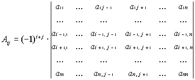 2. algebraische Ergänzung Aij (Adjunkte,Unterdet.) des Elementes aij einer Determinante |A| n-ter Ordnung: Produkt aus Vorzeichen (-1)i+j und einer Determinante (n-1)-ter Ordnung, die man aus |A| erhält, in dem man die Zeile und die Spalte streicht, auf deren Kreuzung das Element aij steht                                                                                     aus        folgt: