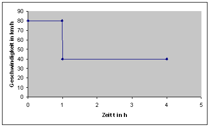 Ein PKW legt auf einer Landstraße in 1,5 Stunden 70 km zurück. Danach legt er eine halbstündige Pause ein. Im Anschluss fährt er eine halbe Stunde mit einer Geschwindigkeit von 140 km/h auf der Autobahn. Zum Schluss folgt eine einstündige Ortsdurchfahrt mit 40 km/h. Alle Bewegungsabschnitte sollen annähernd gleichförmig ablaufen.