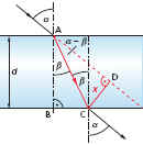 Aufgabe: Berechnen Sie den Betrag der Parallelverschiebung des durchfallenden Lichtstrahles gegenüber dem einfallenden Strahl an einer aus leichtem Kronglas bestehenden, planparallelen Platte der Dicke d = 5 cm , wenn der Einfallswinkel α = 45° beträgt!