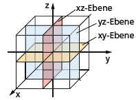 kartesisches Koordinatensystem:  . Koordinatenachsen stehen paarweise senkrecht aufeinander
