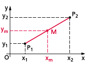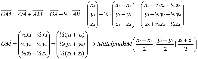 Zur Berechnung der x-Koordinate des Mittelpunktes M einer Strecke P1P2 betrachtet man die kongruenten Dreiecke P1QM und MRP2 (Punkt Q(xm|y1) und Punkt R(x2|ym). Da in kongru- enten Dreiecken einander entsprechende Strecken gleichlang sind, gilt: xm - x1 = x2 - xm woraus für xm folgt:   Analog kann man aus diesen Dreiecken ableiten:. Die Koordinaten des Mittelpunktes M ergeben sich also aus den arithmetischen Mitteln der beteiligten Punktkoordinaten.